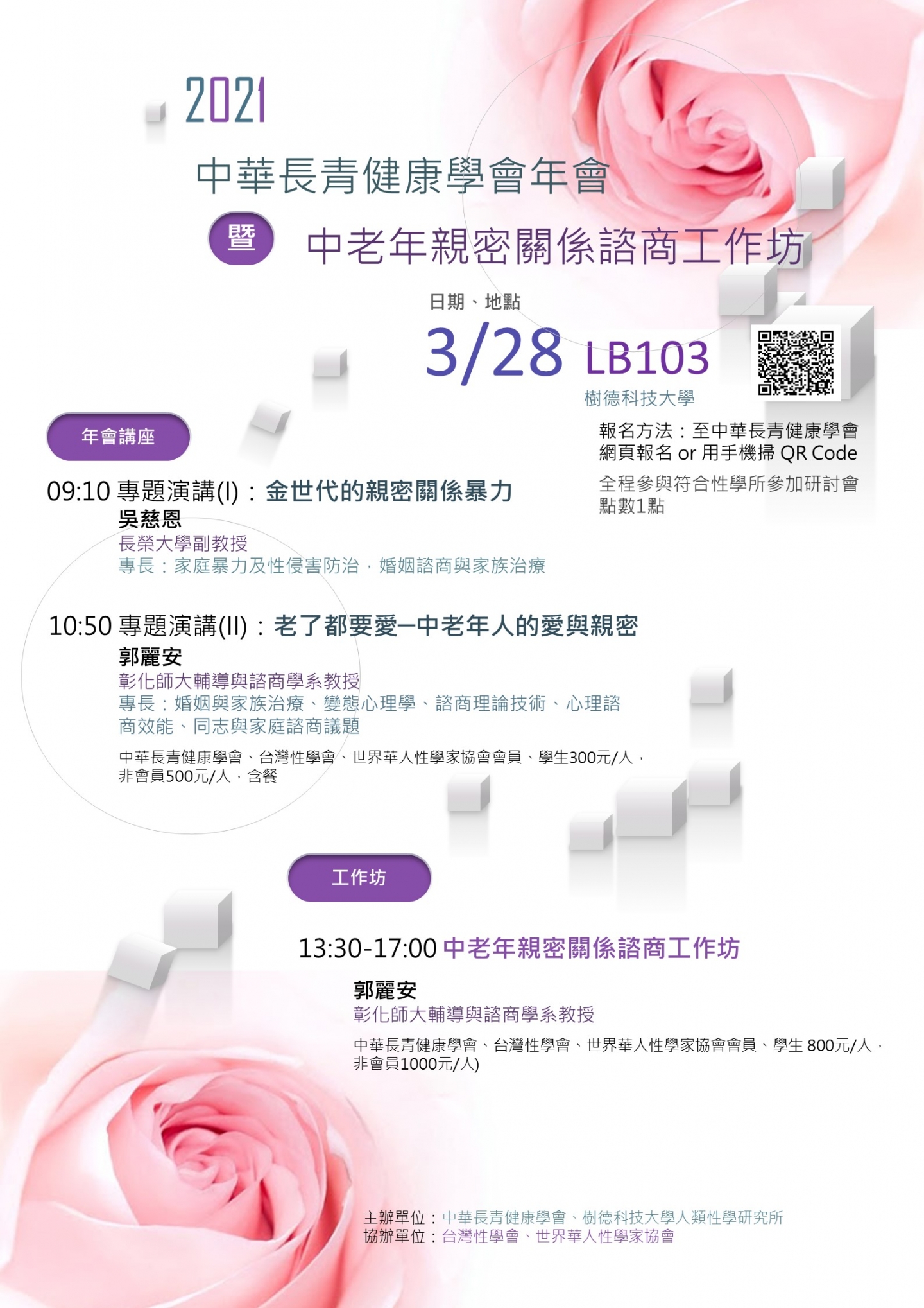 | 13:30-15:10 | 中老年親密關係諮商工作坊 | 郭麗安教授 |