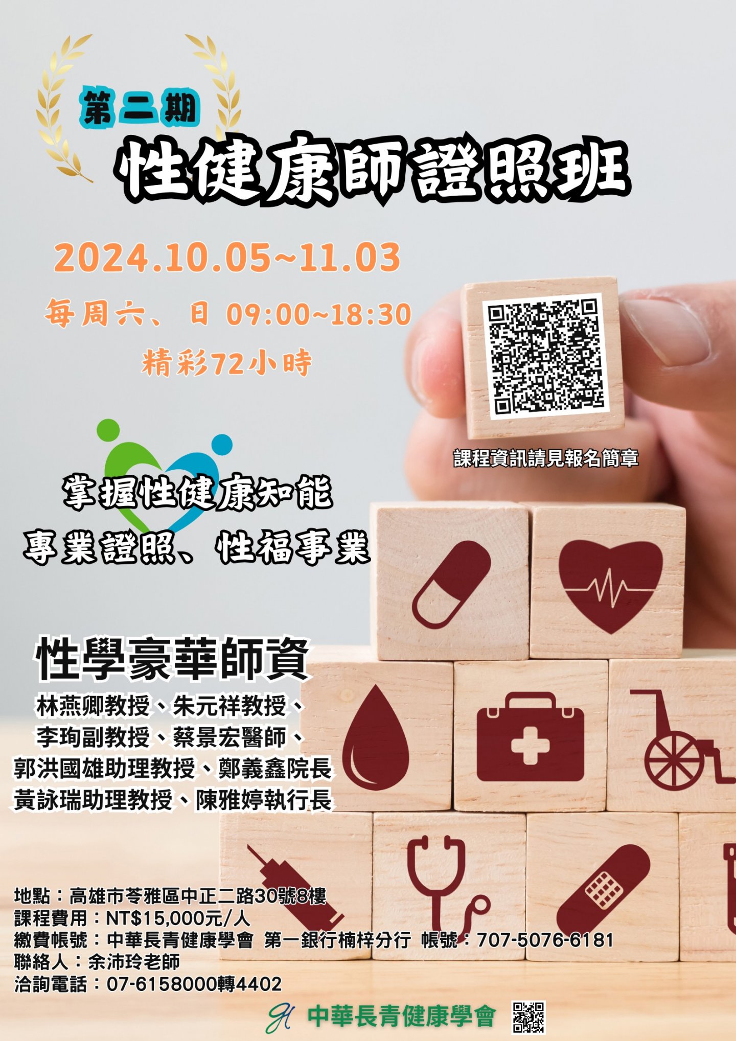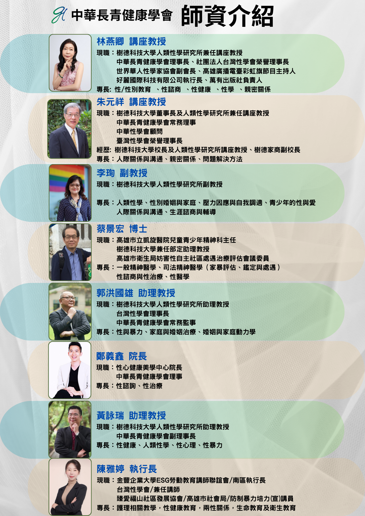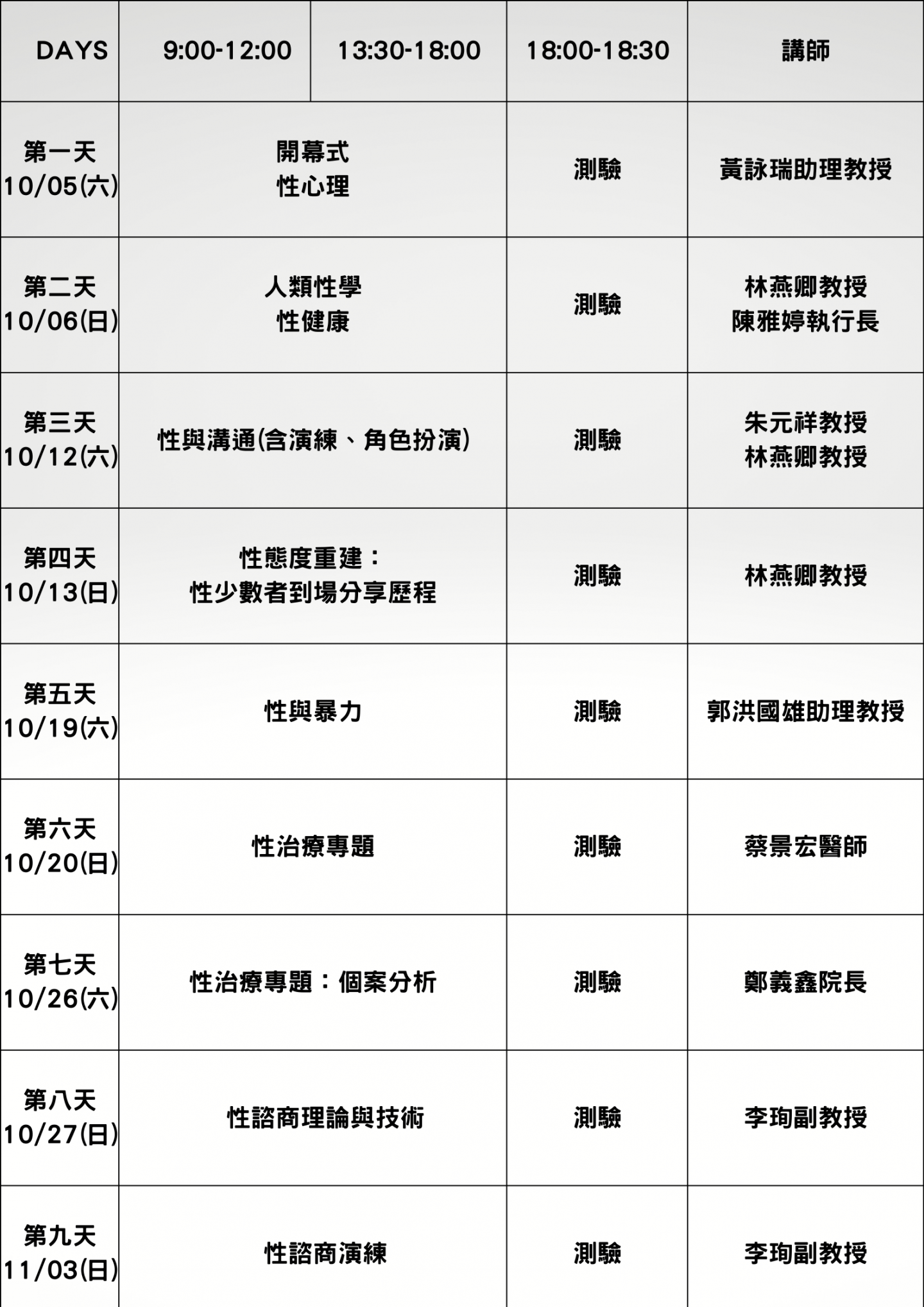五、課程內容:人類性學、性健康、性與溝通、性治療、性心理、性與暴力、性諮商理論與技術